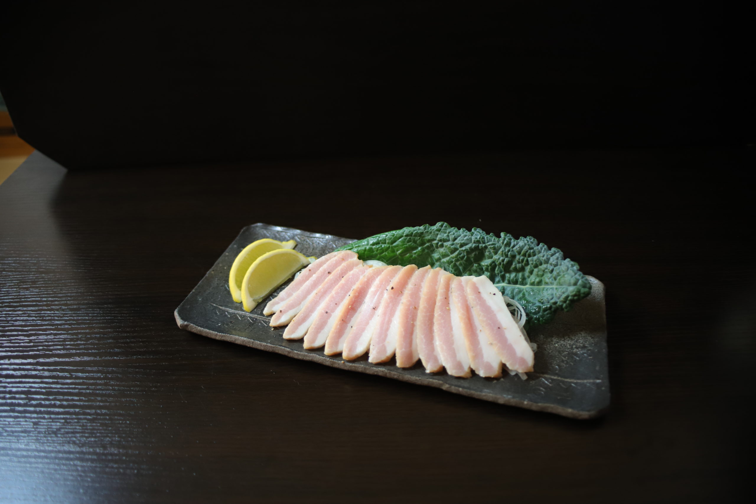 【豚トロスモーク(スライス)】熱量:384kcal,炭水化物:2.8g,タンパク質:11.9g,食塩相当量:0.4g,脂質:6.2g